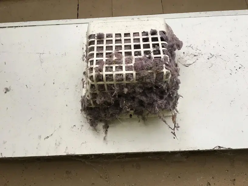 Heavy lint buildup inside bird guardHeavy lint buildup inside bird guard over dryer vent.