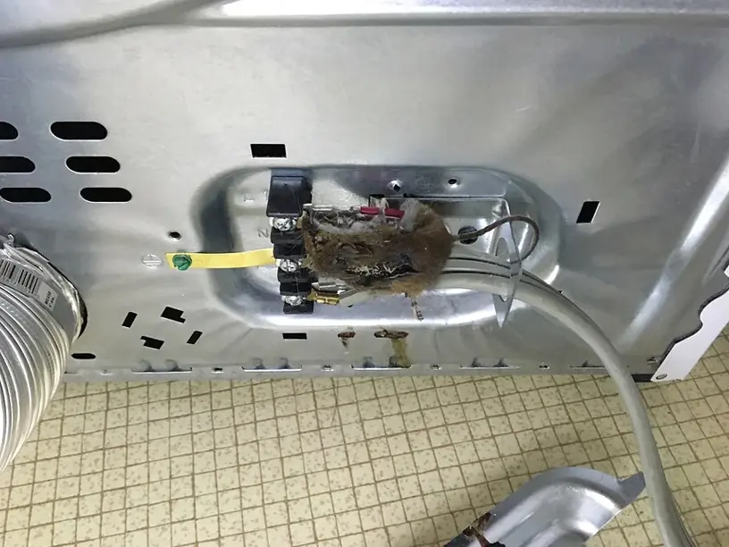 Our customer was complaining of a dead animal smell. We found a dead mouse stuck to the electrical terminals of the dryer. Stinky!
